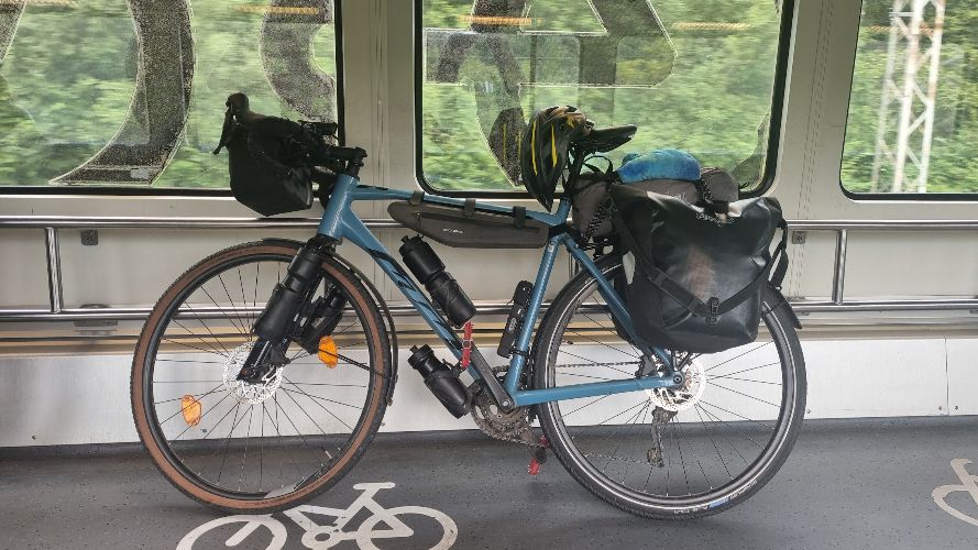 Das Gravelbike ist mit seinem HELLBLAUEN RAMEN und den ROTEN PEDALEN (Aufschrift: "ready to race") sehr leicht zu identifizieren (siehe Fotos).